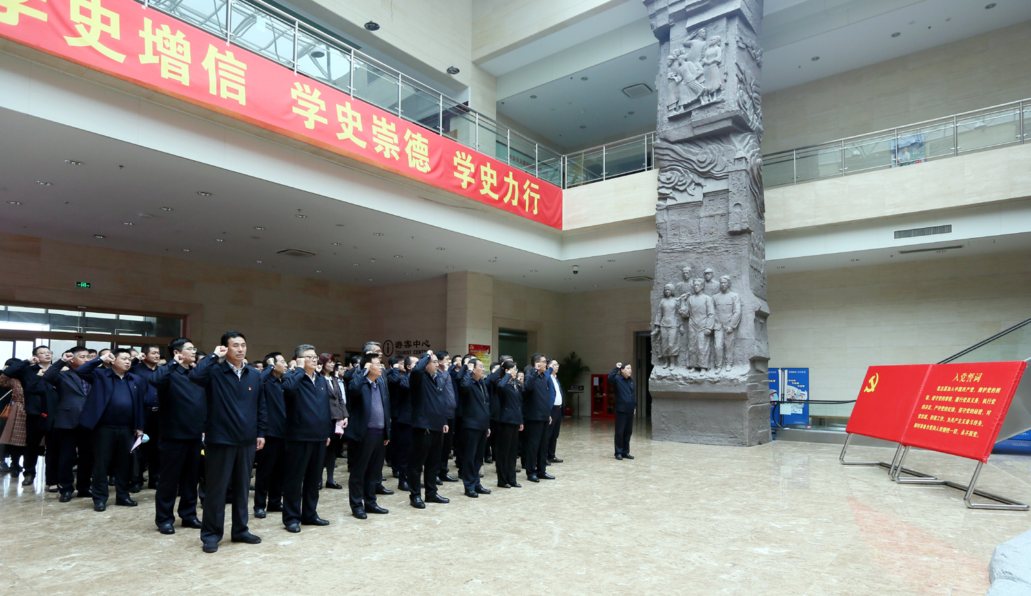 4月22日下午,集團公司黨委在市革命紀念館舉辦“學史明理守初心、砥礪奮進擔使命”黨性教育實境課堂。集團黨委班子成員,各單位黨建、紀檢、工會分管領導、黨群工作部(學教辦)負責人,集團總部助理以上管理人員80余人參加。 走進市革命紀念館,在鮮紅的黨旗下,全體黨員舉起右拳,重溫入黨誓詞,鏗鏘有力的誓詞,進一步激發黨員干部牢記黨的初心和使命。在紀念館展室,大家認真看、仔細聽,通過歷史文獻、革命文物、新聞圖片和視頻資料,真切感受到中國共產黨領導海屬地區人民在五四運動、土地革命、抗日戰爭、解放戰爭時期血與火的革命斗爭史。