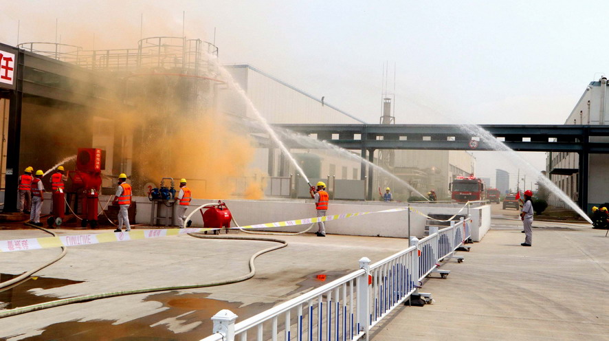 演練活動根據方案進行現場實景模擬,在碳氫罐區發生泄漏后,神特公司應急搶險組、滅火救援組、醫療救護組根據預案進行現場處置搶險,并配合開發區消防隊緊急堵漏搶修,排除險情。