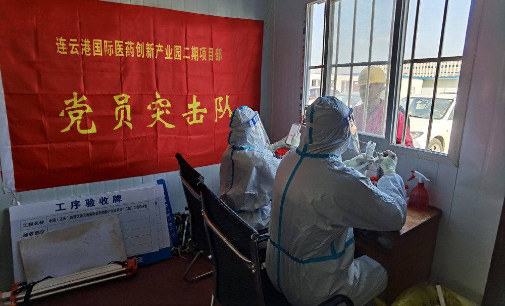 “請(qǐng)大家保持一米線,戴好口罩,有序參與核酸檢測(cè),謝謝配合!”來(lái)自市級(jí)重大項(xiàng)目連云港國(guó)際醫(yī)藥創(chuàng)新產(chǎn)業(yè)園二期項(xiàng)目黨員突擊隊(duì)的成員席時(shí)棟、陳家輝喊道。據(jù)悉,該項(xiàng)目目前按照上級(jí)相關(guān)規(guī)定,實(shí)行閉環(huán)管理,做好相關(guān)疫情防控工作。“我們項(xiàng)目部嚴(yán)格按照市、開(kāi)發(fā)區(qū)相關(guān)規(guī)定,做好閉環(huán)施工,疫情防控、項(xiàng)目建設(shè)兩手抓、兩手硬。”來(lái)自集團(tuán)棚戶區(qū)改造裕源三期項(xiàng)目負(fù)責(zé)人青年黨員徐震說(shuō)道。