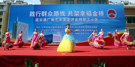 為了貫徹黨的群眾路線教育實(shí)踐活動精神,豐富基層職工的精神文化生活。628日上午,由連云港廣電傳媒集團(tuán)和集團(tuán)公司共同主辦的“踐行群眾路線,共架幸福金橋”連云港廣電藝術(shù)團(tuán)走進(jìn)鹽場職工小區(qū)文藝演出在猴嘴昌圩湖社區(qū)拉開帷幕。廣電傳媒集團(tuán)領(lǐng)導(dǎo)戴詠寒、馬富勝、萬自力,集團(tuán)公司領(lǐng)導(dǎo)顧永庚、鄭宜虎、戴鴻鳴與數(shù)百名鹽場職工群眾歡聚昌圩,共同欣賞來自連云港廣電新聞綜合頻道的主持人和編輯記者與金橋職工自編自演的精彩節(jié)目。