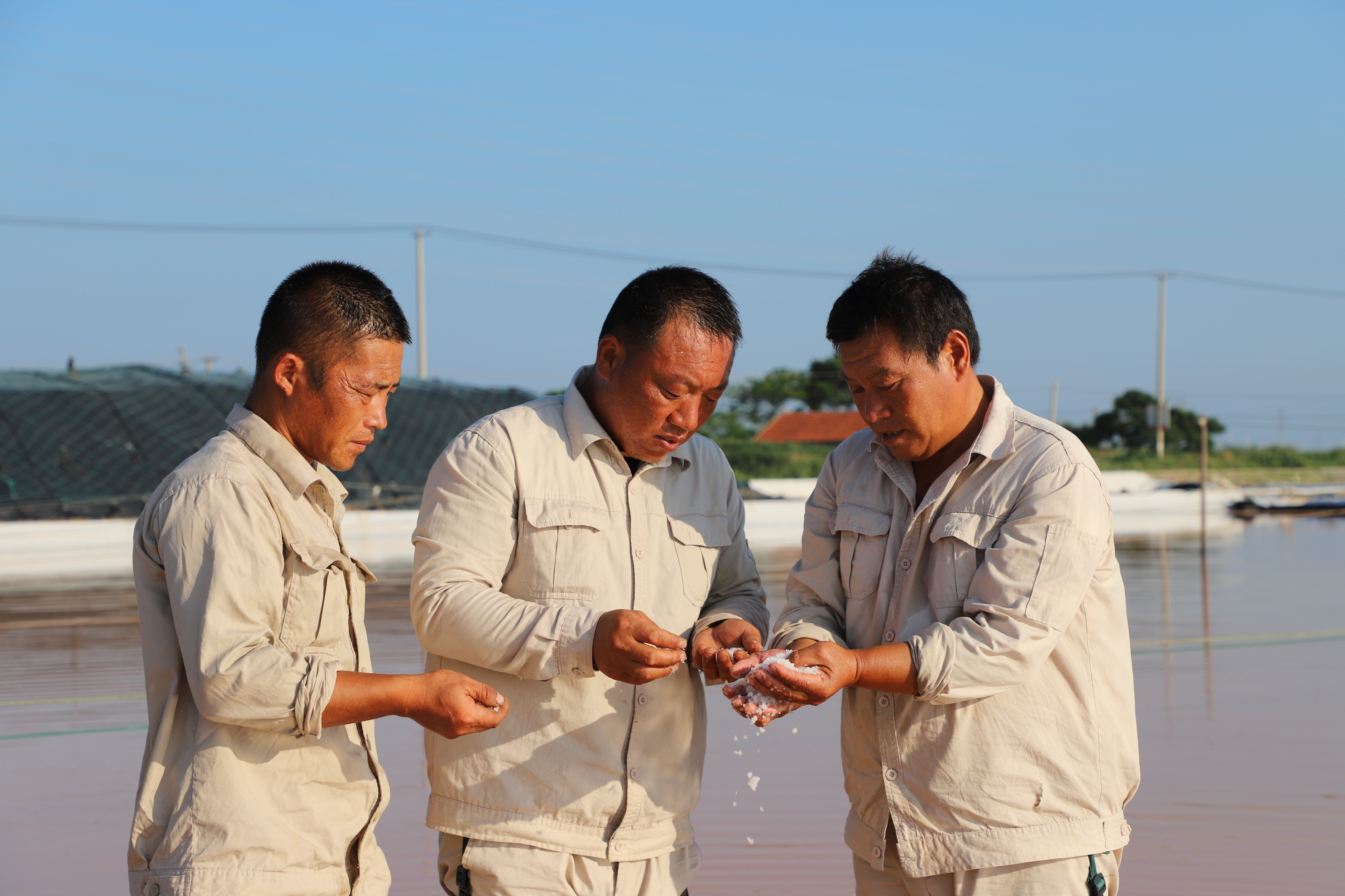 “氣溫越高,鹽的蒸發量就越高,公司效益就好,按今年的產鹽趨勢,超額完成公司指標任務應該不成問題,我們工人心里也高興呀!”勞模祝星星擦著臉上的汗珠自豪的說道。“晴天一身汗,雨天一身泥”是制鹽人的家常便飯,為確保汛期安全生產,避開高溫時段作業,凌晨五點鐘,工人們已忙著鹵水除硫、維護收拉塑布收房系統、修補塑……。鹽工身上的汗水與鹵水交織在一起,浸濕了工作服,透過驕陽他們黝黑的臉龐顯得越發的锃亮。