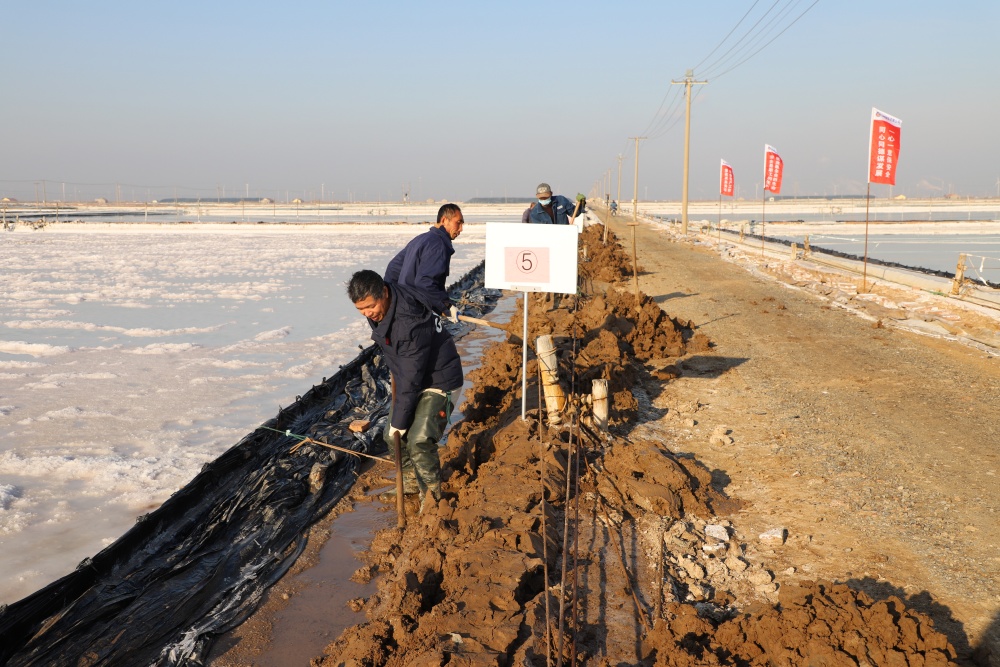 寒冬時節,暖陽之下,鹽廩之旁,曬得黝黑的鹽場產業工人們按照競賽的考核標準,做熟泥、打堰墻、做堰頂,護埝頂、夯埝坡、清塘底,見證了一場技能比拼的盛會。經過一天的鏖戰,潘成軍師徒取得了池堰修整第一名;董治波師徒取得了土塘清淤第一名。(西工)