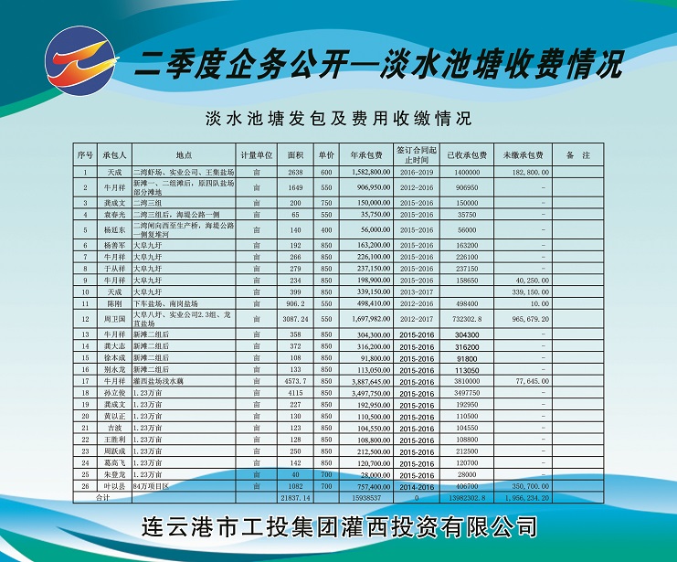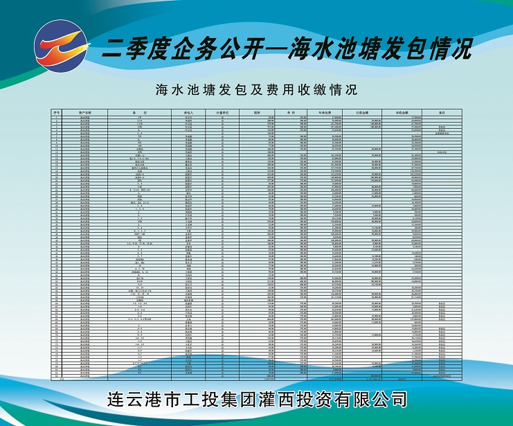 2、海水養(yǎng)殖池塘發(fā)包及費(fèi)用收繳情況。共發(fā)包海水養(yǎng)殖池塘面積13073.83畝,應(yīng)收租賃費(fèi)421.787萬元,已收租賃費(fèi)221.39萬元,欠收租賃費(fèi)200.397萬元,收繳率為52%。