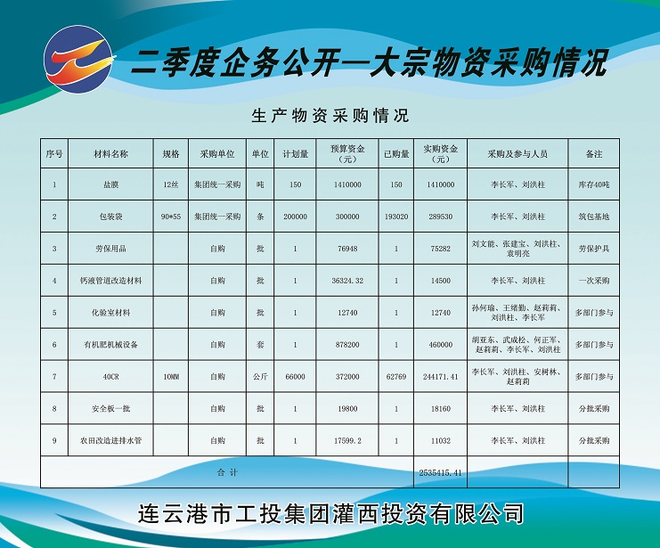1、由集團(tuán)公司集中采購塑料布(鹽膜)150噸(由工投集團(tuán)運(yùn)營監(jiān)管部在總部組織招標(biāo))、包裝袋20萬條,實(shí)購金額計(jì)169.953萬元。