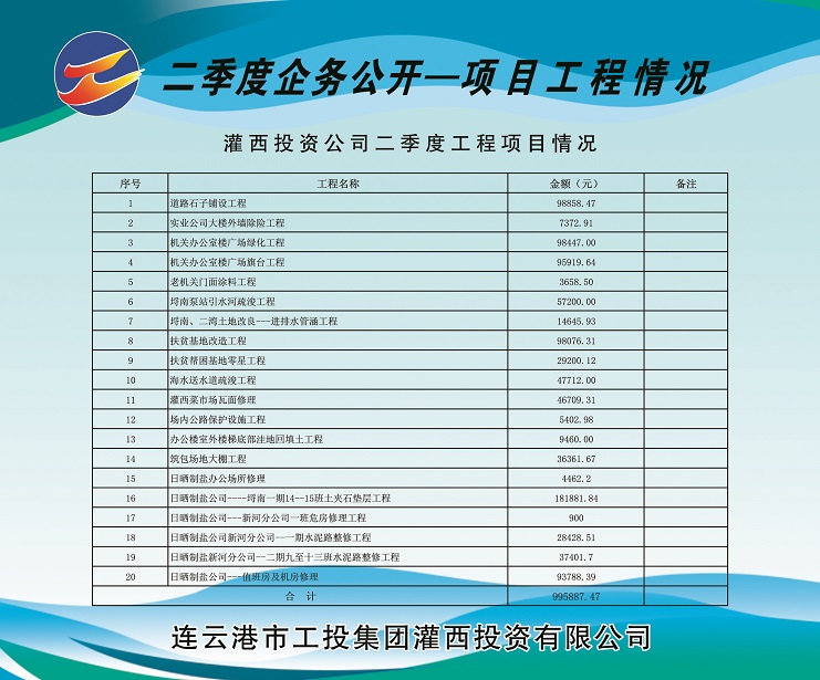 道路石子鋪設(shè)工程98858.47元;實(shí)業(yè)公司大樓外墻除險(xiǎn)工程7372.91元;機(jī)關(guān)辦公樓廣場(chǎng)綠化工程98447.00元;機(jī)關(guān)辦公室樓廣場(chǎng)旗臺(tái)工程95919.64元;老機(jī)關(guān)門面涂料工程3658.50元;埒南泵站引水河疏浚工程57200.00元;埒南、二灣 土地改良—進(jìn)排水管涵工程14645.93元;扶貧基地改造工程98076.31元;扶貧幫困基地零星工程29200.12元;海水送水道疏浚工程47712.00元;灌西菜市場(chǎng)瓦面修理46709.31元;場(chǎng)內(nèi)公路保護(hù)設(shè)施工程5402.98元;辦公樓室外樓梯底部洼地回填土工程9460元;筑包場(chǎng)地大棚工程36361.67元;日曬制鹽辦公場(chǎng)所修理4462.2元;日曬制鹽公司---埒南一期14—15班土夾石墊層工程181881.84元;日曬制鹽公司---新河分公司一班危房修理工程900元;日曬制鹽公司新河分公司—一期水泥路整修工程 28428.51元;日曬制鹽新河分公司一二期九至十三班水泥路整修工程37401.7元;日曬制鹽公司---值班房及機(jī)房修理93788.39元