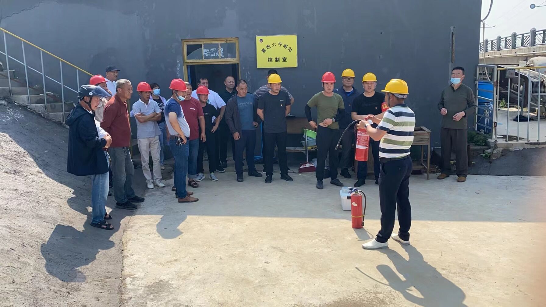 現場總指揮由經理江德全擔任,副總指揮由分管安全經理孫曉波擔任,滅火人員為六圩閘班組人員和其他閘站班組人員。分管安全領導負責主持、組織全單位人員按火災事故應急預案的要求進行模擬演練。這次模擬演練以2022年6月的某一天,班組生產現場因設備或線路短路等不明原因導致某設備突然冒煙,進而起火燃燒,并且火勢迅速蔓延擴大。在大家齊心協力的撲救行動中,火勢慢慢變小,最后熄滅。事后,責令相關責任人寫出書面報告,必須以最快的方式逐級上報,如實匯報,不得隱瞞。