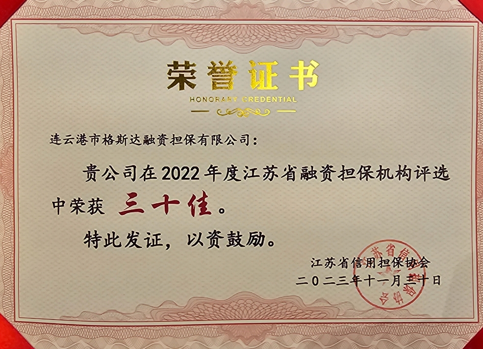 ??3月23日,江蘇省信用擔保協(xié)會在南京召開會議。連云港市格斯達融資擔保有限公司被授予“江蘇省2022年度融資擔保機構(gòu)三十佳”榮譽。本次全省共有71家融資擔保機構(gòu)參加評選,格斯達擔保公司成功入選。