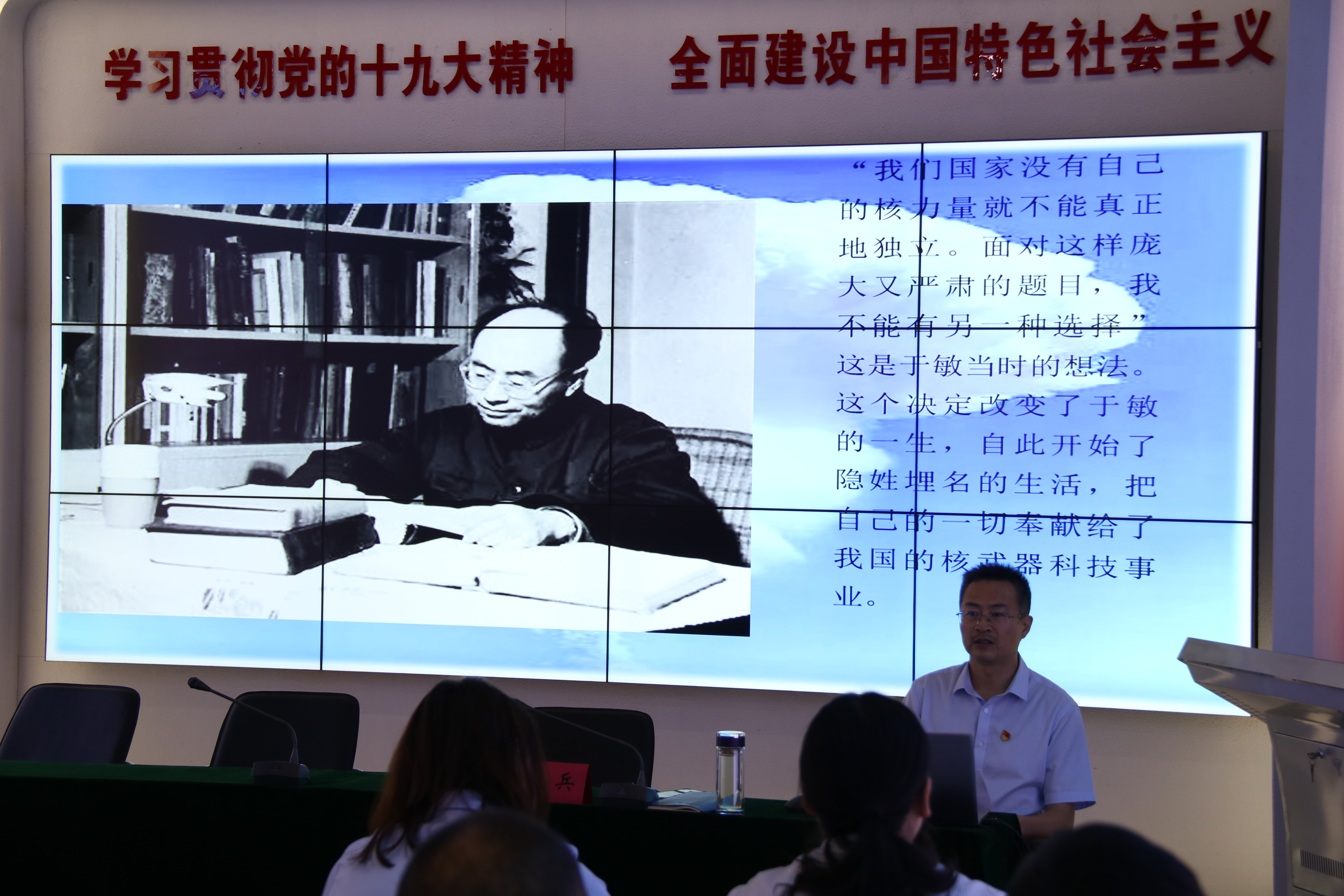 徐兵從六個方面詳細講解了“兩彈一星”功勛獎章、國家最高科學技術獎獲得者,國防科技事業改革發展的重要推動者,于敏同志“肩負重任,祖國的需要高于一切”的傳奇事跡。號召全體黨員職工學習于敏堅持絕對忠誠的政治品格。在火熱的陽光下,在鮮艷的黨旗前,在茫茫的戈壁灘上,于敏同志無愧于“共和國鑄劍師”,其“錚錚鐵骨”精神更是我們每一位黨員干部學習的楷模。學習于敏堅持高度自覺的大局意識,幾十年來舍小家、顧大家,為了國家核事業發展的大局毅然選擇對家人“隱身”、對社會隱姓埋名。于敏同志這面旗幟,映射出一個信念:用一輩子,做一件有意義的事!