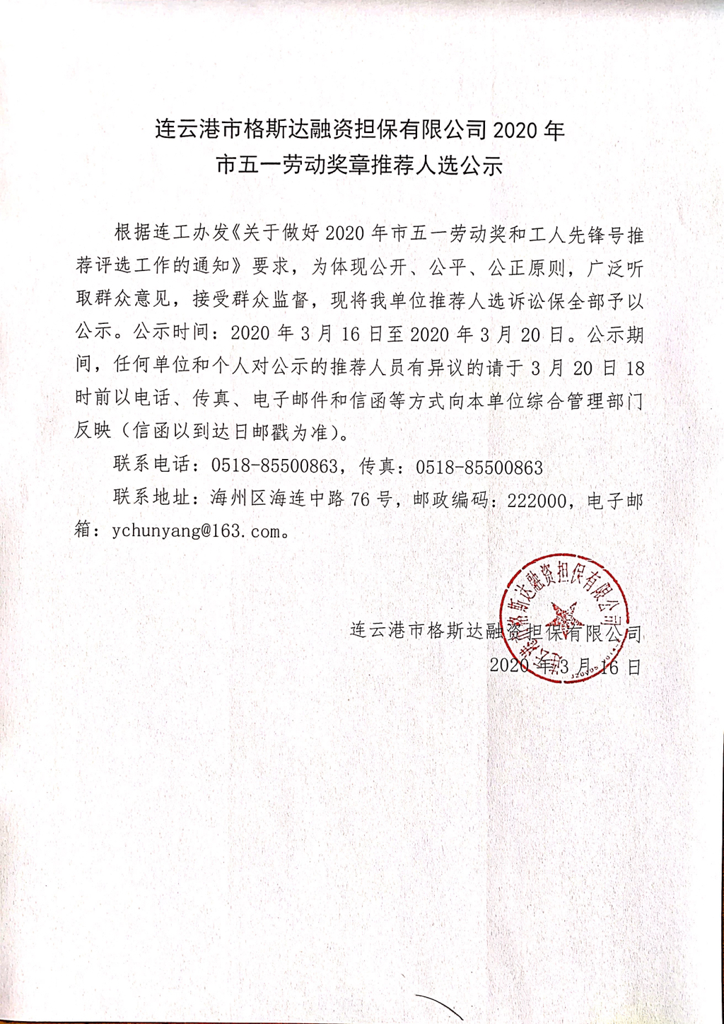 連云港市格斯達融資擔保有限公司2020年市五一勞動獎章推薦人選公示