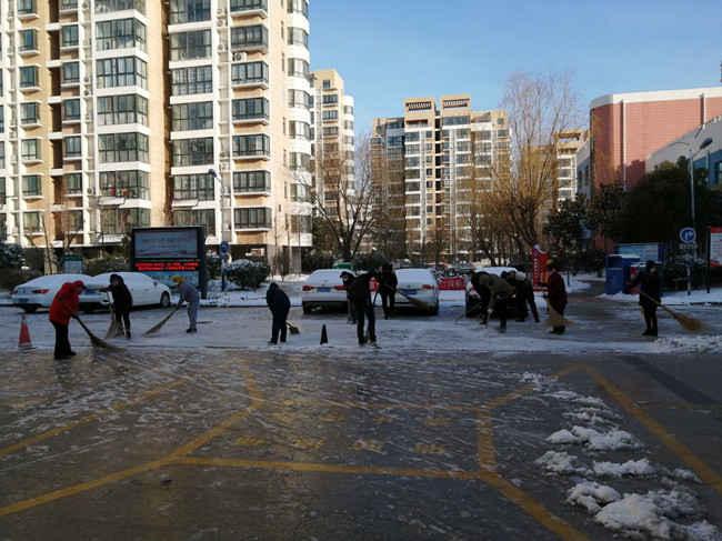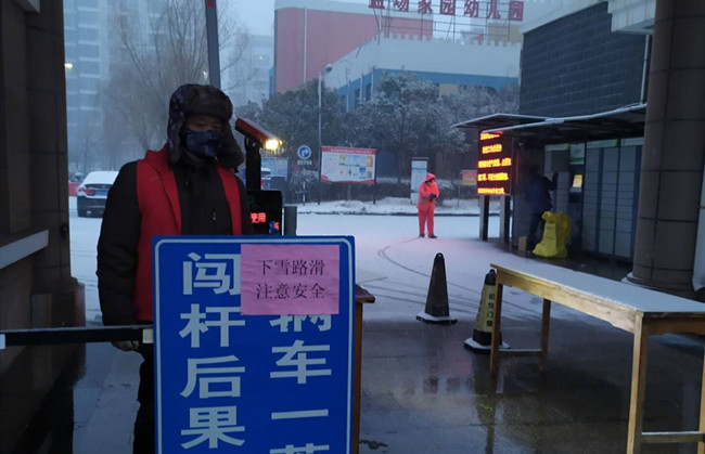 作為公司職工居住的鹽場家園小區,按照金海社區要求,執行封閉管理,每戶只發一個通行證,除門衛外,管理人員全部參與輪流值班。特殊天氣時,大門的看守更加嚴格與認真,值班人員對過往的人員登記、量體溫,確保沒有問題后才給與放行。大雪洋洋灑灑,清晨的鹽場家園銀裝素裹,泰祥物業的工作人員,佩戴好口罩,拿著掃帚彎著腰,揮動手中的工具在清理積雪。雪已結成冰,但他們不畏寒冷,堅毅有力,鏟掉冰凍。寒冷的天氣,絲毫沒有影響大家的熱情,先主路后支路,逐漸掃出一條整潔的路面,疫情面前,泰祥物業人用行動用嚴格用責任溫暖了業主的心。