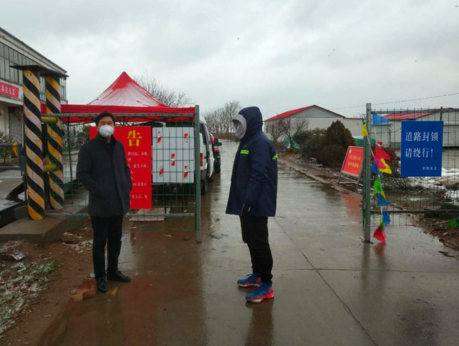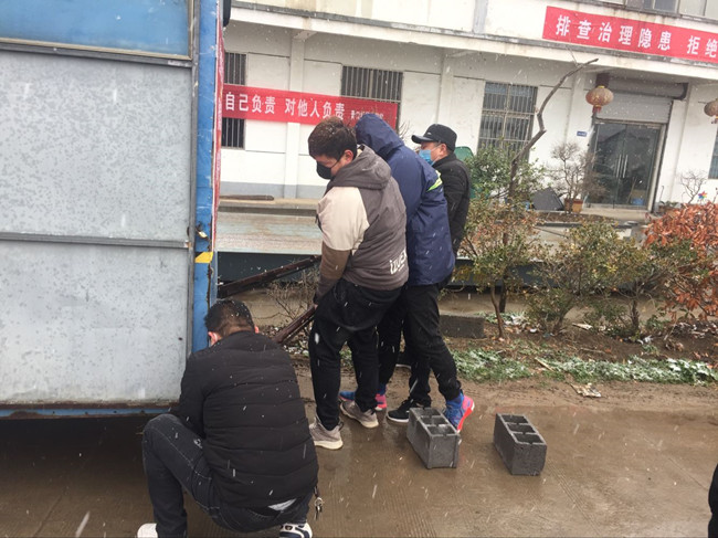 公司黨委書記、董事長胡傳法冒雪檢查成業飼料卡口,胡書記囑咐在現場值班的團青干部防控一線,要動真格不能含糊,堅決不給外來車輛通過。負責這里還有生產生活服務中心和黃沙分場的全體管理干部,大家都很辛苦,但沒有埋怨,都在默默地堅守崗位,履行職責。你不站崗我不站崗,誰保衛咱大場他們是這樣說也是這樣做的。為了讓值守人員有一個溫暖的臨時休憩的場所,泰祥公司將一個臨時集裝箱拉到卡口,后勤班的小伙子們,搬運調試固定,絲毫沒有因為寒冷的天氣影響工作進度。