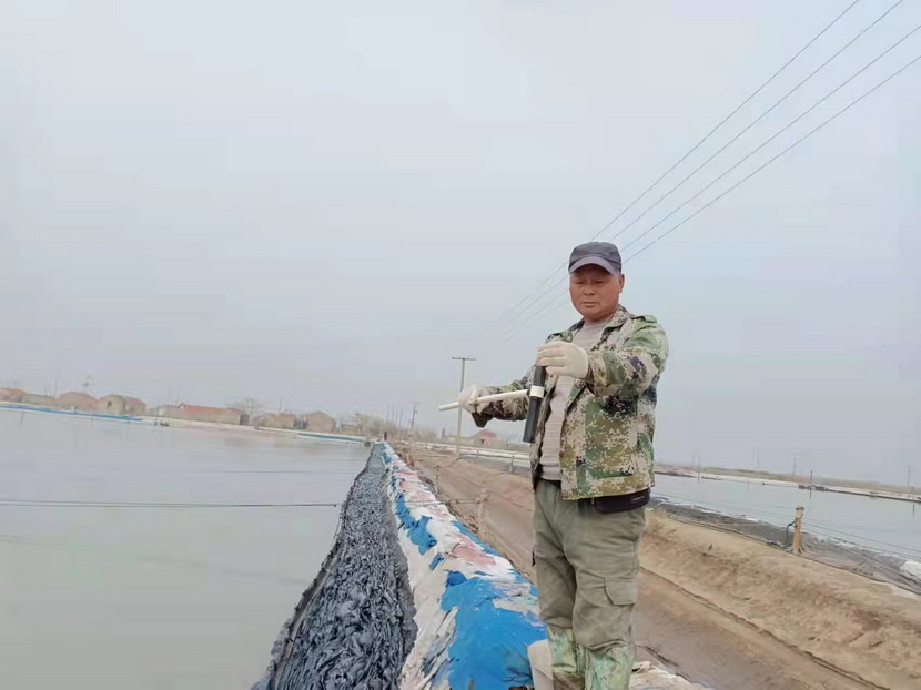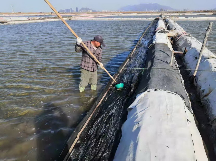 2021年,他服從公司生產(chǎn)機(jī)制的轉(zhuǎn)換,被安排到海濱三組18號灘作為領(lǐng)灘手,負(fù)責(zé)鈣液生產(chǎn)。為了不浪費每一毫米的蒸發(fā)量,每天天剛蒙蒙亮,就能看見他在縱橫阡陌的鹽田間穿梭,根據(jù)灘田結(jié)構(gòu)、針對不同季節(jié)確定走水路線,每天重復(fù)著調(diào)節(jié)鈣液、修整溝堰、修補(bǔ)塑布的工作,遇到大雨,他就不回家,守在灘上,及時把鈣液按照不同濃度引進(jìn)鹵臺、鹵窖,雨水結(jié)束,第一時間把灘面淡水排掉,將鈣液回引進(jìn)行晾曬。在生產(chǎn)面積僅有311畝的情況下,他每天要走3萬-4萬步,不僅對他自己的生產(chǎn)單元,對整片鈣液生產(chǎn)單元了如指掌,有多少閘門,多少電線桿,都了然于心。全年下來,生產(chǎn)鈣液28000方,在12個鈣液生產(chǎn)單元中名列前茅,領(lǐng)先超9000方,實至名歸的生產(chǎn)標(biāo)兵。