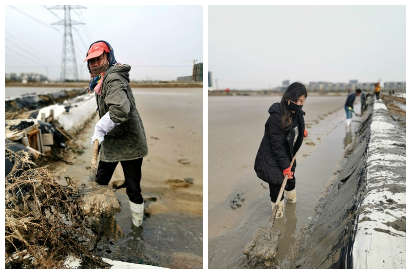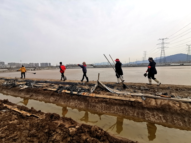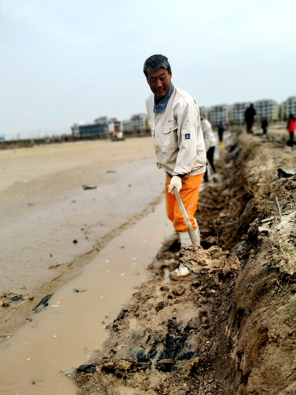 往東邊看,先鋒東灘黨旗招展分外鮮紅,海州灣公司18個單元職工、3名班組長全員出動馳援大浦工區協同重整410閑置鈣鹽灘地。引水入溝、翻泥上堰、腳踩和整、鐵掀蹋平,動作嫻熟。1200余米的10條池堰僅用一天的就順利完工。
