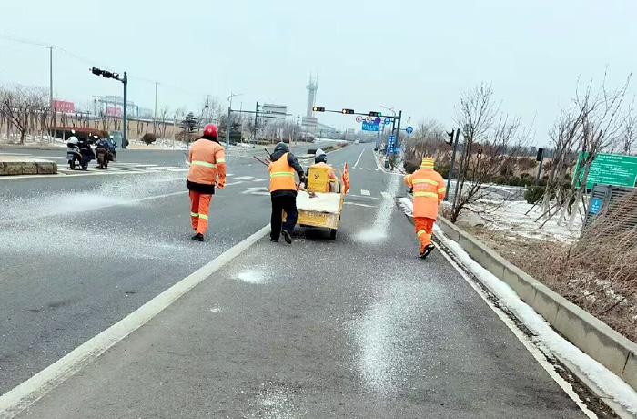 該分公司黨員突擊隊(duì)兵分3路,分別來(lái)到徐圩大道、港前大道、海濱大道核心路段。生產(chǎn)骨干沈萬(wàn)軍、李傳武、張樹華等同志他們相互配合,手拿鐵锨簡(jiǎn)單有效的進(jìn)行撒放融雪劑60余噸。發(fā)現(xiàn)道路低洼結(jié)冰處及車輛轉(zhuǎn)彎口,他們立即下車?yán)醚╃P,有來(lái)有回的將冰凍鏟除,消除路面一切安全隱患。