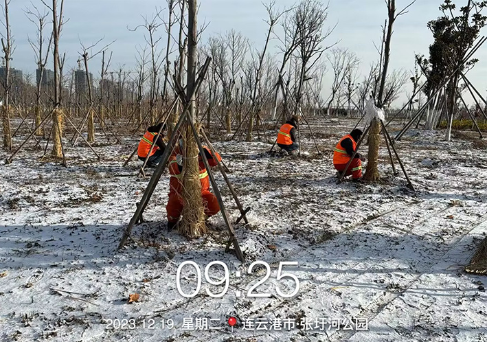 同時(shí),各班組還對新植樹木、不耐寒樹木進(jìn)行草繩裹干,確保樹木安全越冬。在樹木刷白裹干前刮去樹皮上的粗翹皮和苔蘚等寄生物,清理樹皮縫,堵塞老樹洞,進(jìn)一步提高園林樹木冬季防寒工作質(zhì)量。