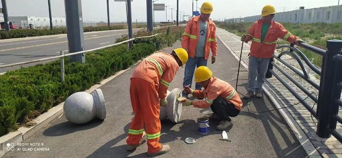 維修班組成員經過多日實地考察,結合道路現場實際情況制定了維修計劃,并對部分道路上擋車樁點位、間距設置進行了合理調整,來規避擦碰現象發生。在石化三路一處施工現場,兩組隊員頂著炎炎烈日正在非機動車道上進行擋車柱安裝工作,他們配合默契,利用開孔鉆、鐵锨等工具開孔、清掏、埋設樁柱,然后用混凝土填充、壓實地下部分,最后整平路面。安裝好之后將有效阻止機動車隨意占用人行通道,達到安全目的。本次施工共安裝維修擋車柱36個、穩固球狀擋車石約180多處。